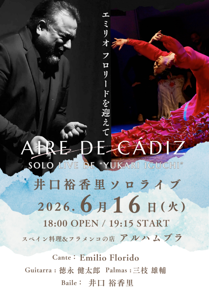 長きに渡って親交のあるエミリオが現地カディスから運んできてくれるアイレ、エレガントかつ熟したフラメンコをスーパーフラメンコなギタリスト徳永健太郎さん、パルメーロ三枝雄輔さんと共に全身全霊で踊らせて頂きます。